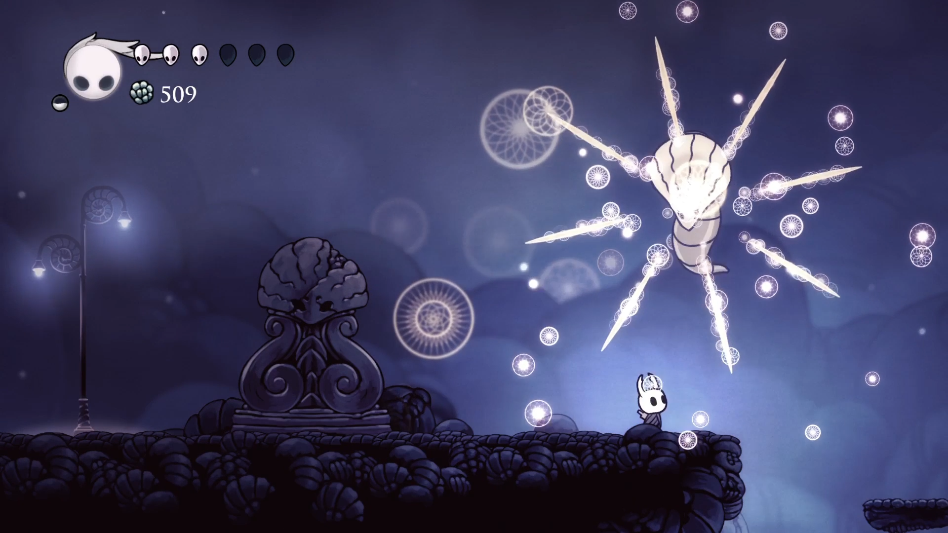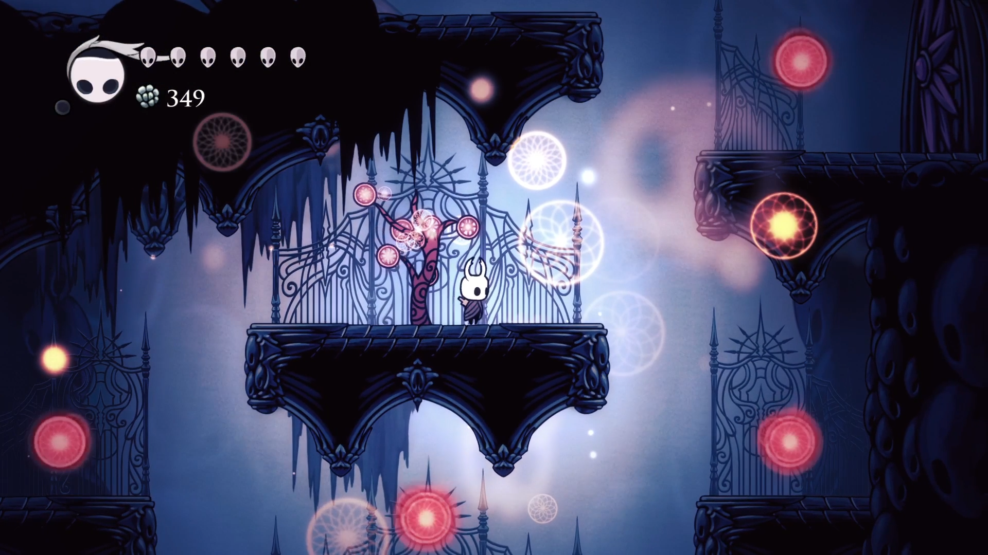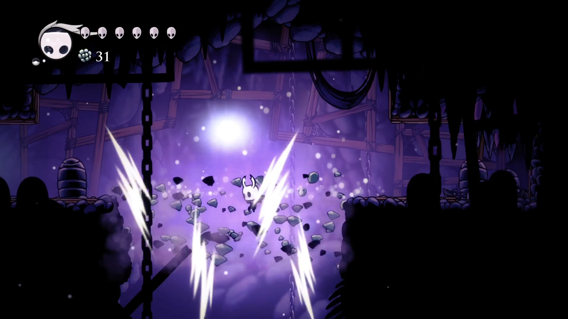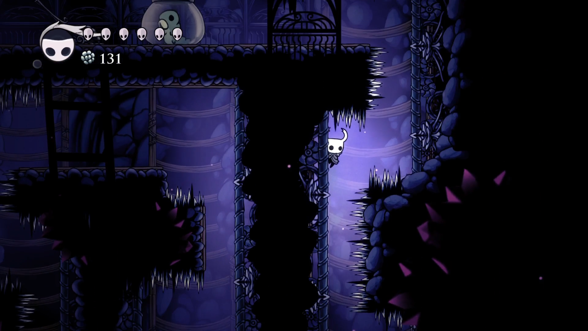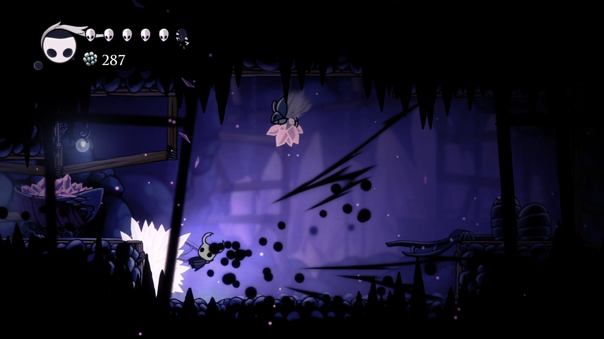 Кристальный Пик (именно так называется эта локация) встретил меня бронированными врагами и большой концентрацией платформинг секции. Враги очень неплохо разваливаются магией, но это здорово только когда есть запас духа. А когда его нет, приходится подгадывать тайминги чтобы бить в определенные уязвимые места. Вот этих жуков на скриншоте снизу можно бить только по морде, ото всех других мест гвоздь отскакивает как от шипов.